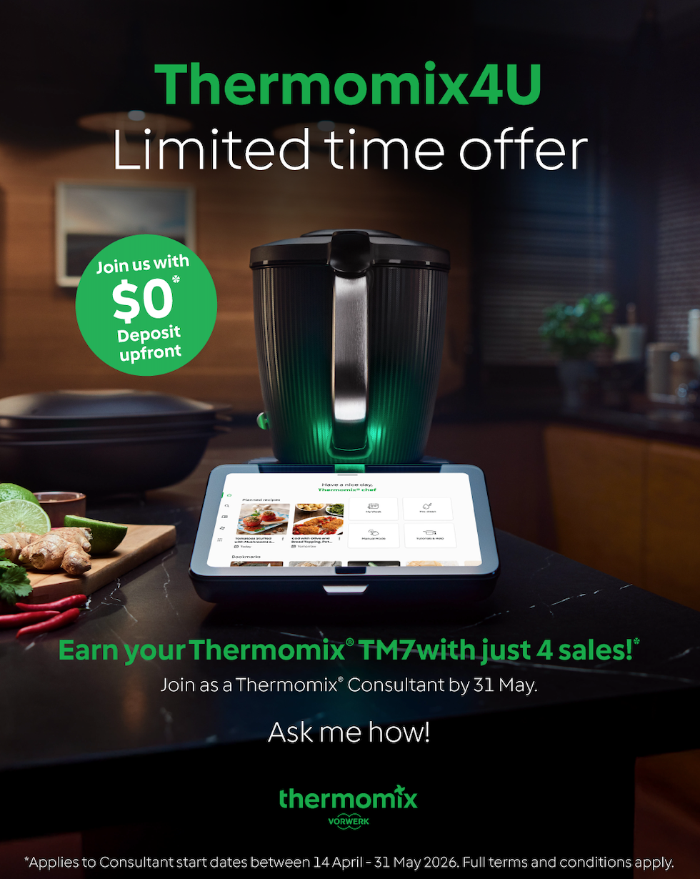 Kickstart your 2026 by jumping into the Thermomix® fun. Become a Thermomix® Consultant with $0 Deposit and every sale you make within your first 90 days reduces the cost of your own TM7. Make just 4 sales and your TM7 is yours to keep.*